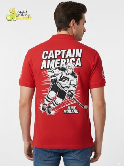 The 2025 Stitchy Bunny “Captain America” Graphic Polo Shirt is a tribute to hockey legend Mike Modano, known as one