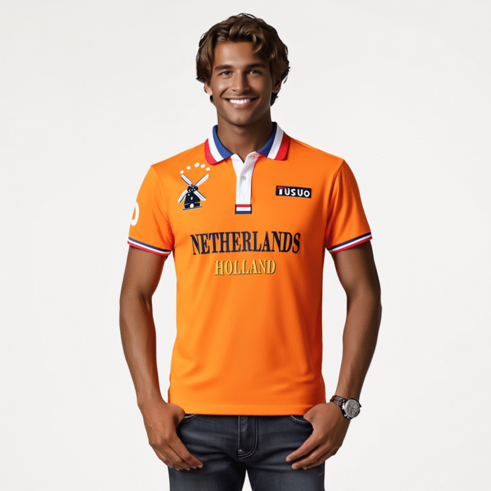 Cheer for the Dutch in style with the Men’s Netherlands Soccer Fan Shirt. Featuring a slim-fit design in iconic orange with blue accents, this shirt is crafted with durable stitching and a breathable collar for all-day comfort. The bold Netherlands lettering makes it perfect for national team matches, casual outings, or even semi-formal events. A must-have for soccer supporters, it blends sporty flair with everyday versatility.