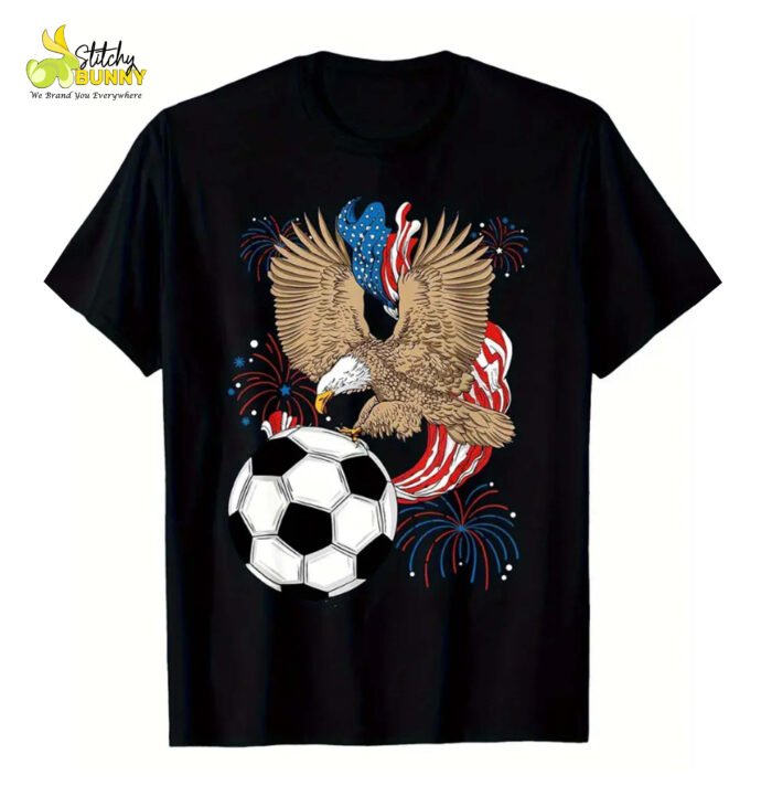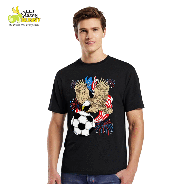 Celebrate America in style with the Men’s Patriotic American Flag Soccer T-Shirt. Designed in bold black with a striking bald eagle and fireworks graphic, this heavyweight 220gsm cotton tee is perfect for the 4th of July, Independence Day events, soccer games, and holiday celebrations. With its classic round neckline, durable fabric, and quality print finish, it’s a versatile game-day outfit for both teens and adults who want to showcase their patriotic spirit.