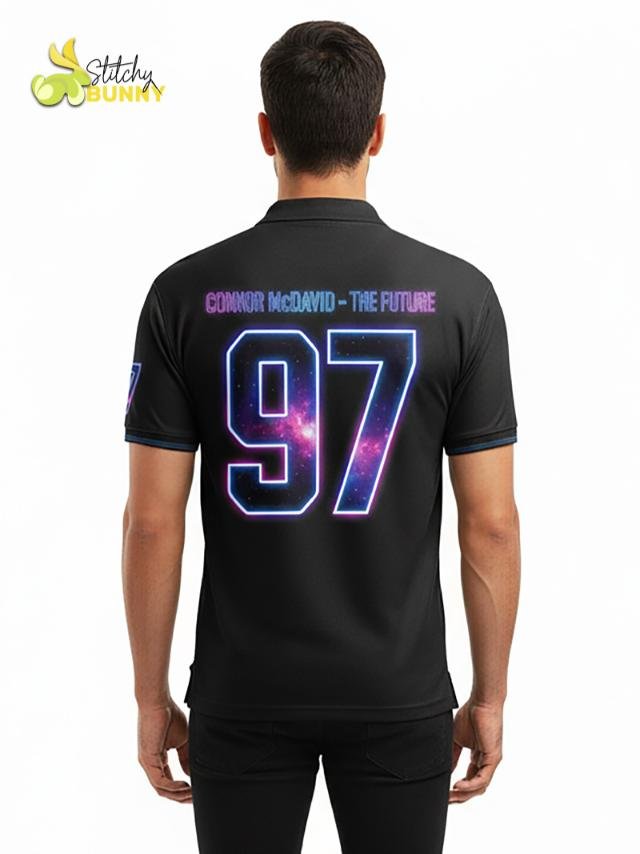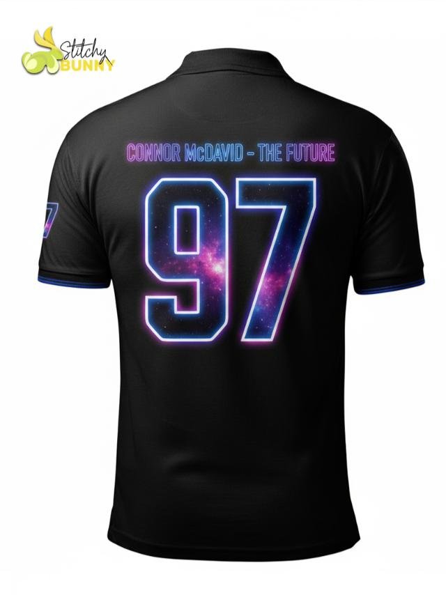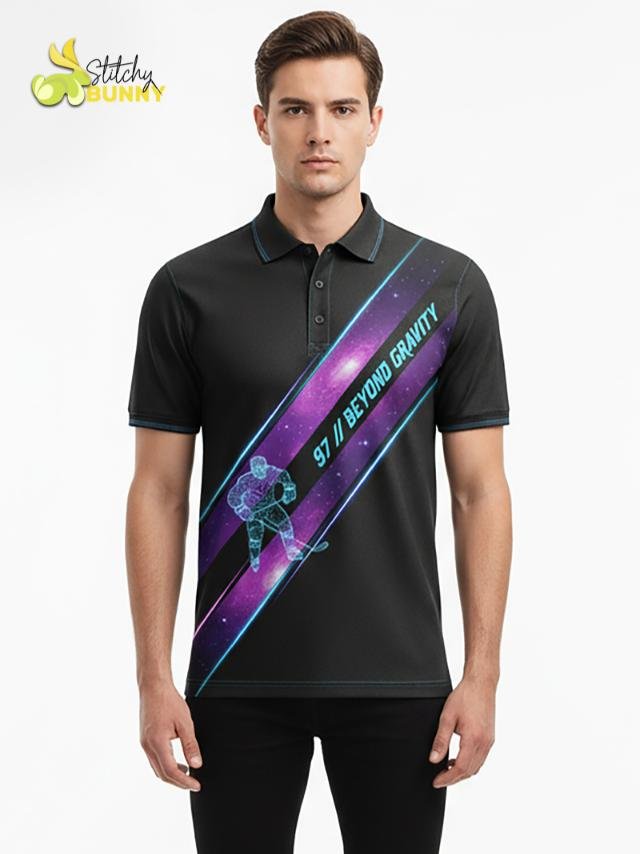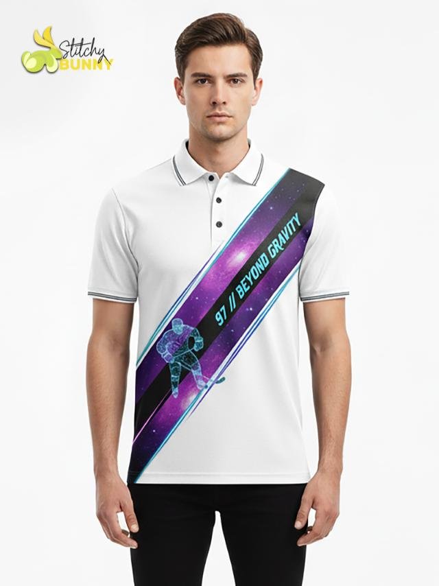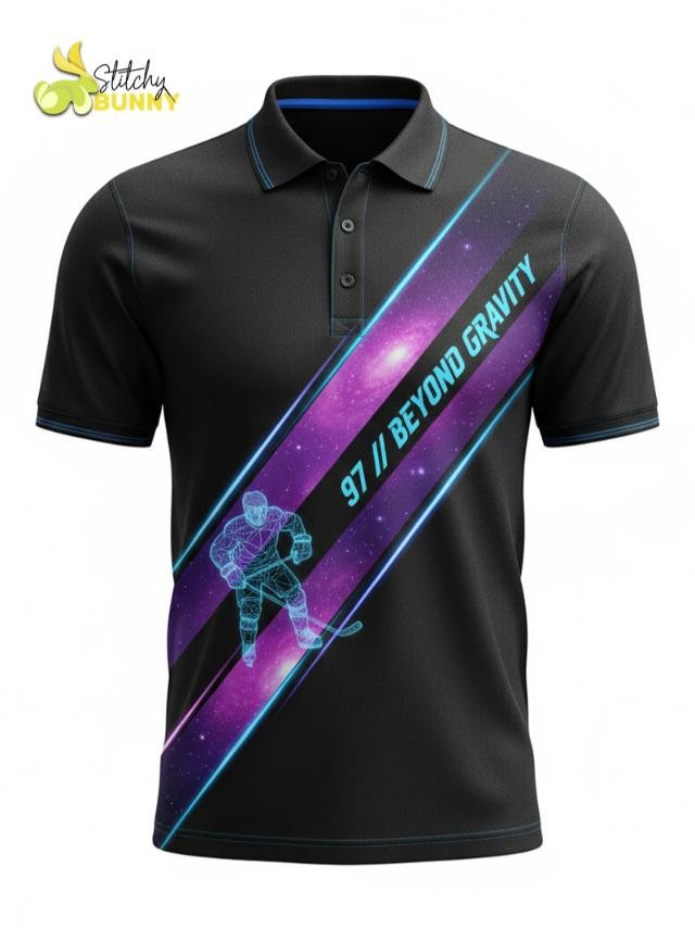 The 2025 Stitchy Bunny Beyond Gravity Polo Shirt takes hockey-inspired style to the next level with its cosmic design and futuristic look. Featuring a striking diagonal galaxy stripe with a glowing hockey player silhouette, this polo combines performance comfort with bold, space-age graphics.