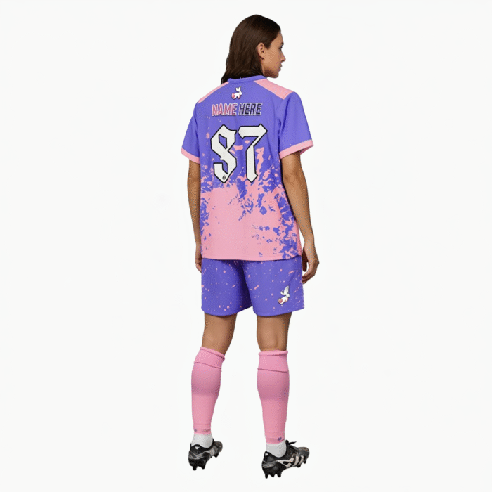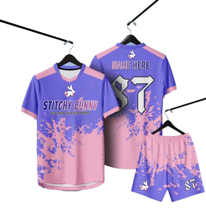 Turn heads on and off the field with the Stitchy Bunny Custom Pink & Purple Sports Kit. Designed for performance, comfort, and standout style, this set combines athletic function with fashion-forward energy. The vibrant pink base is paired with abstract white graphic patterns, giving it a modern and expressive look perfect for teams, training sessions, or streetwear-inspired activewear.