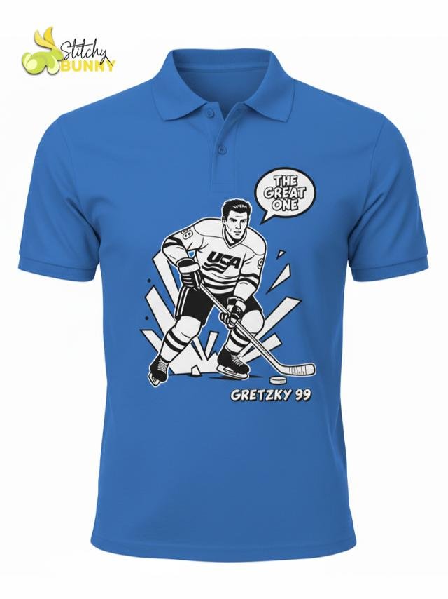 Celebrate hockey royalty with the 2025 Stitchy Bunny “GRETZKY 99 – The Great One” Polo Shirt. Designed for true hockey fans, this shirt features a comic-style graphic of a USA player with the bold “THE GREAT ONE” label — a nod to Wayne Gretzky’s legendary #99 legacy. Perfect for showing your hockey passion with style.