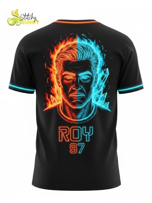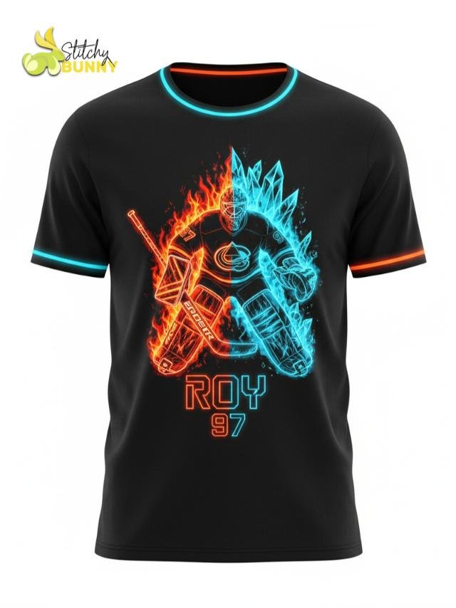 The front features a blazing, split-color goalie in action, while the back reveals a striking, fiery and icy portrait with the iconic “ROY 96” branding. Crafted for comfort and durability, this tee delivers unbeatable style both on and off the ice.