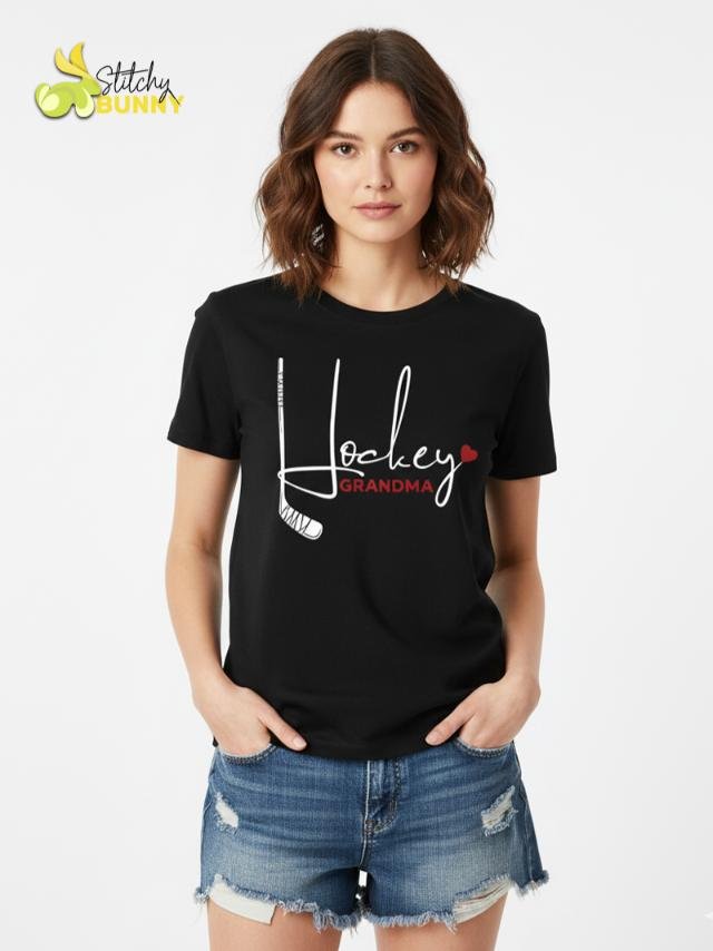 Celebrate your love for hockey and family pride with the Stitchy Bunny Women’s Hockey Grandma T-Shirt. This stylish and comfortable tee features a unique design combining sporty elegance with heartfelt sentiment, perfect for grandmas who cheer from the sidelines or hit the rink with passion. The sleek black fabric highlights the crisp white hockey stick graphic and the bold “Hockey Grandma” text accented with a charming red heart—making this shirt a must-have for hockey fans everywhere.