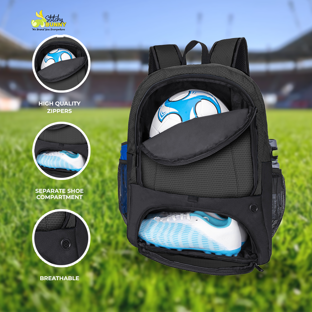 The Stitchy Bunny Youth Sports Backpack is designed for young athletes who play multiple sports. It features a separate vented front ball compartment to easily carry your soccer ball, basketball, volleyball, or football, keeping gear organized and odor-free.